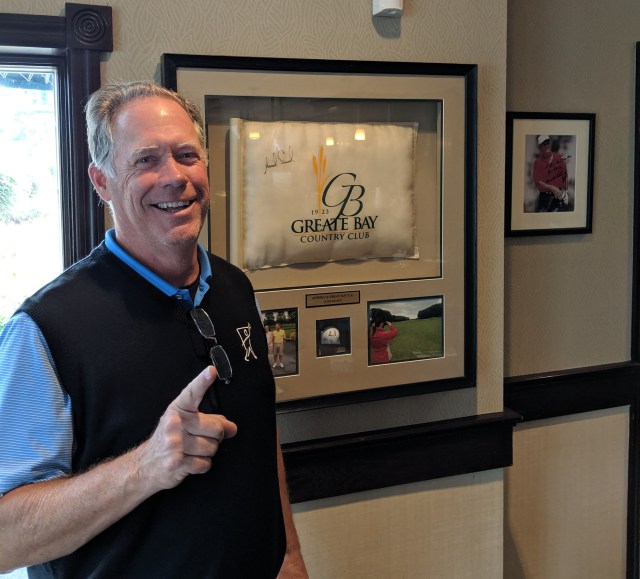 Le Petite Café was showing a video of the Marc Bohan June 25th makeup round for this tournament. He played with Keith MacGregor, Eddie Hannan and Dan Swanson who were playing a makeup for the 9 hole tournament played on June 18th. Marc dropped par on seven of the first nine holes for a sizzling 38. He slightly cooled off on the back coasting in for a sweet 81, net par, delivering a classic on one of the tour’s most difficult challenges. With Joe Champion the only person to hit net par in the 9 hole lightning shortened tournament, followed by five over on 10 and 11 before the match was called, Vegas offered 2 to 1 odds of any member posting a lower net on the 18 hole, wet, Cart Path Only event. Pierre had no difficulty collecting significant cash from the cafe patrons to place a big bet on Marc.